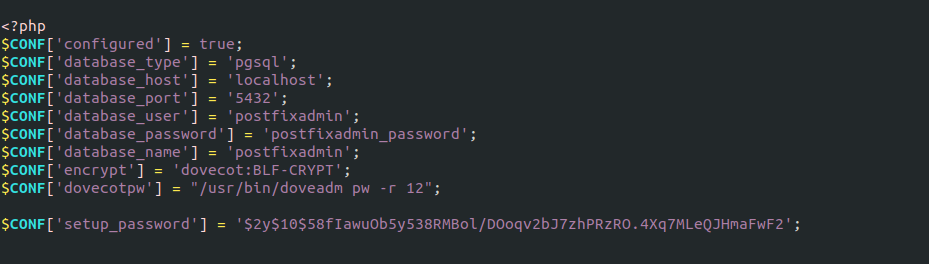 Here is the content that you should have in this file. By default, all lines in this file are commented out, so you can simply copy and paste them at the bottom. Replace postfixpassword with the postfixadmin password you set in Step 4.