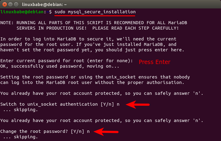 When it asks you to enter MariaDB root password, press Enter key as the root password isn’t set yet. Your root account is already secured, so you should answer n to not set password.