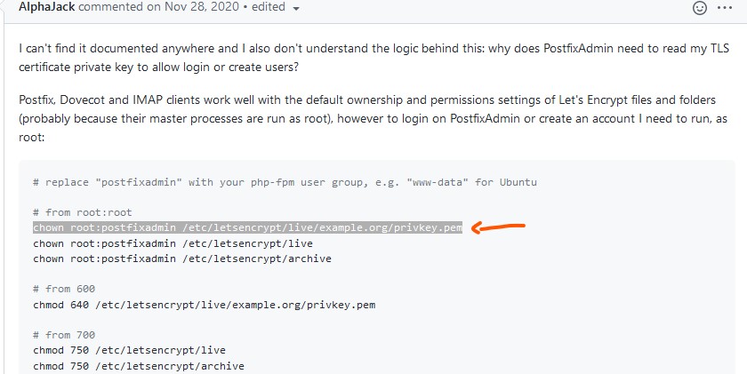 Starting with Dovecot 2.3.11, the web server user needs permission to read Let’s Encrypt TLS certificate in order to do password hashing. Run the following two commands to grant permissions.