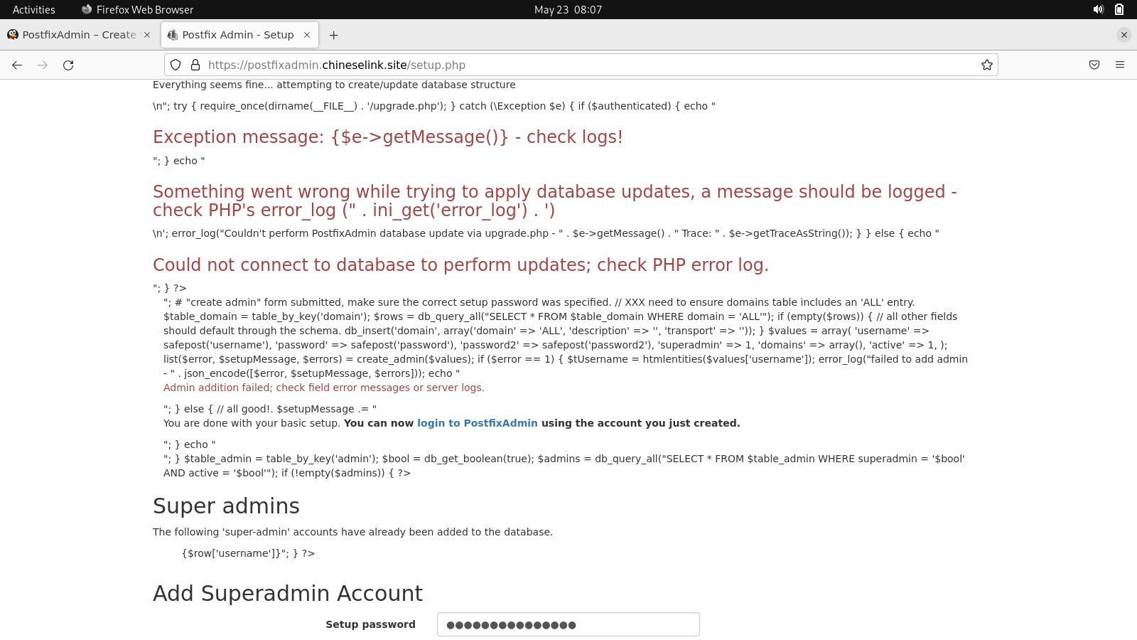 i’m stuck at the step “14”. As postfixadmin has no “Virtual List” but “Aliases” i created a new mailbox using that menu. After clicking the blue button for adding the mailbox after filling in the data postfixadmin doesn’t work anymore – every request times out. “postfixadmin_error.log” shows records whose time is three hours less and the last record is: