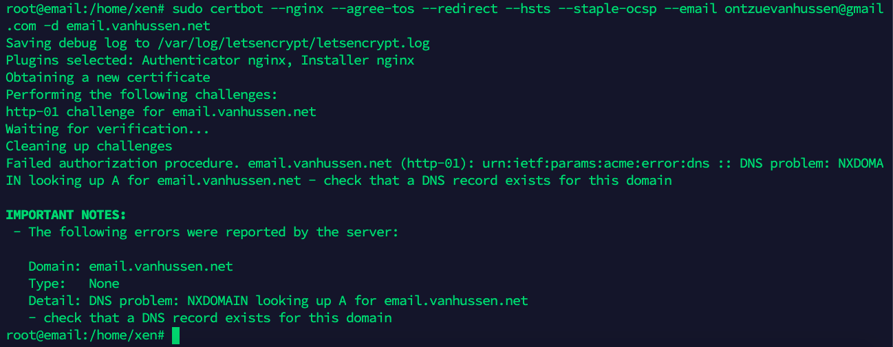 -a nginx: Use the Nginx plugin for authentication--agree-tos: Agree to terms of service.--no-eff-email: Don’t receive emails from EFF foundation.--staple-ocsp: Enables OCSP Stapling. A valid OCSP response is stapled to the certificate that the server offers during TLS.--email: Enter your email address, which is used for important notifications and account recovery.-d: domain, aka your mail server hostname.