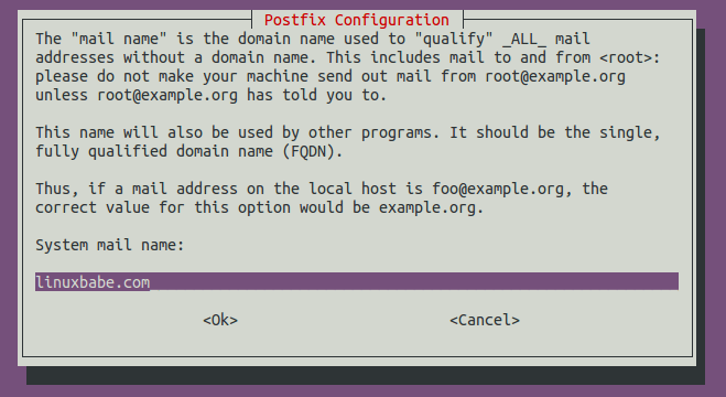 Next, enter your domain name for the system mail name, i.e. the domain name after @ symbol. For example, my email address is [email protected], so I entered linuxbabe.com for the system mail name. This domain name will be appended to addresses that don’t have a domain name specified. Note that if you enter a sub-domain like mail.your-domain.com, you will be able to receive emails destined for @mail.your-domain.com addresses, but not be able to receive emails destined for @your-domain.com addresses.