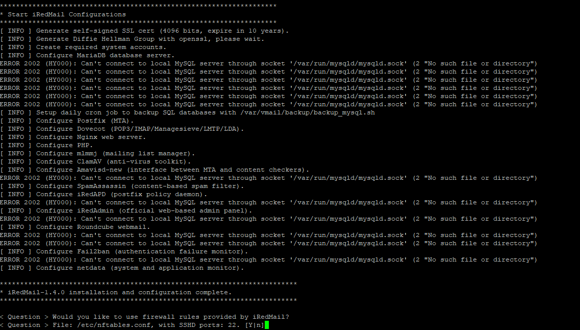 At the end of installation, choose y to use firewall rules provided by iRedMail and restart firewall.