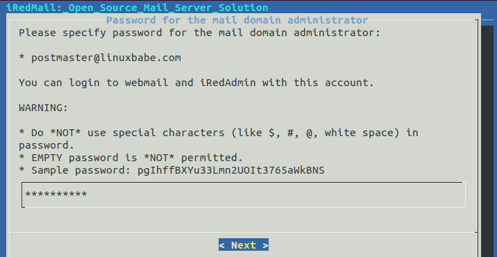 Next, enter your first mail domain. You can add additional mail domains later in the web-based admin panel. This tutorial assumes that you want an email account like [email protected]. In that case, you need to enter your-domain.com here, without sub-domain. Do not press the space bar after your domain name. I think iRedMail will copy the space character along with your domain name, which can result in installation failure.