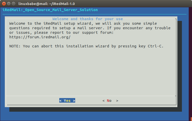 The mail server setup wizard will appear. Use the Tab key to select Yes and press Enter.