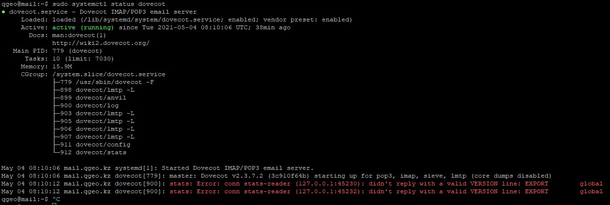May 05 06:54:43 mail.qgeo.kz dovecot[937]: stats: Error: conn stats-reader (127.0.0.1:36650): didn’t reply with a valid VERSION line: EXPORT global