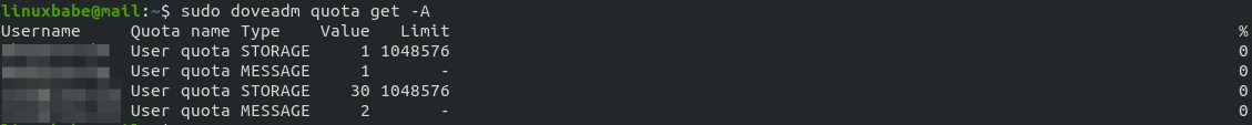 sudo doveadm quota get -A
