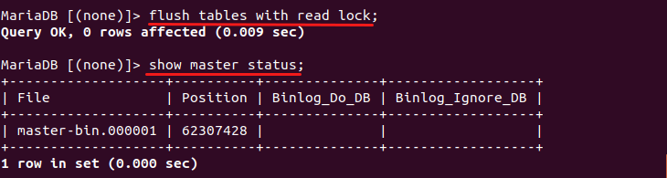 Then obtain the binary log coordinates with the following command. The coordinates are the name of the binary log file currently in use, and the position of the last written event.