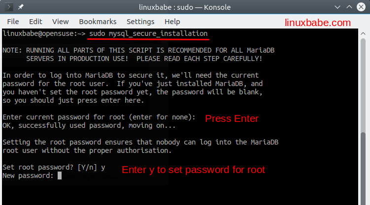 When it asks you to enter MariaDB root password, press Enter because you have not set the root password yet. Then enter y to set the root password for MariaDB server.