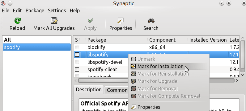After that, you will see the package names that are returned for your search. Right click libspotify and spotify-client and mark them for installation.