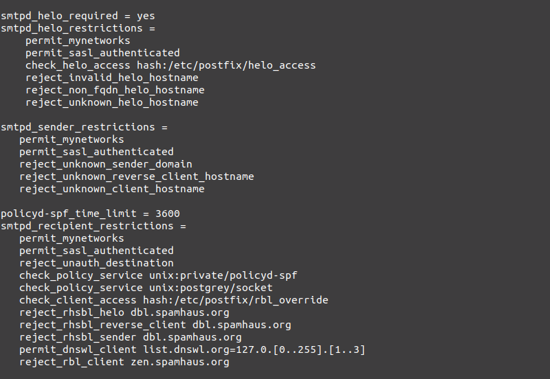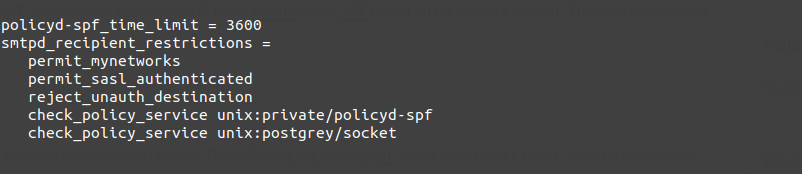 In case you don’t know, the directive check_policy_service unix:private/policyd-spf in the above screenshot will make Postfix check SPF record on the sender’s domain. This directive requires you to install and configure the pypolicyd-spf package.