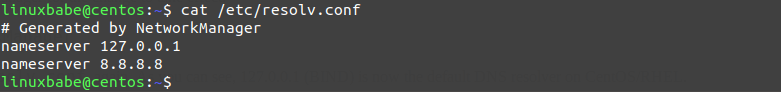 We need to set 127.0.0.1 as the default DNS resolver. You can check the current DNS resolver on CentOS/RHEL with the following command.
