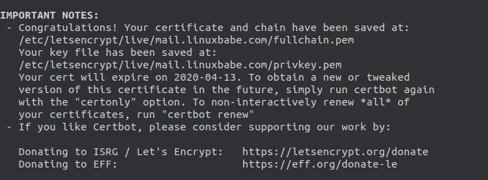 After a while, you should see the following lines which means the certificate is successfully obtained. You can also see the directory under which your cert is stored.