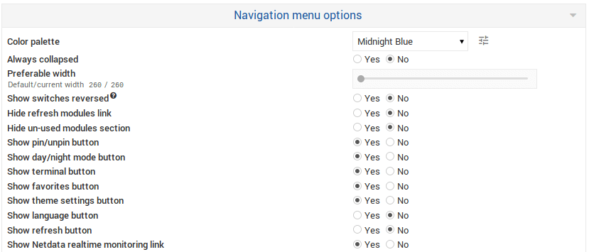 then select navigation menu options and set the color palette. For example, I selected Midnight blue.