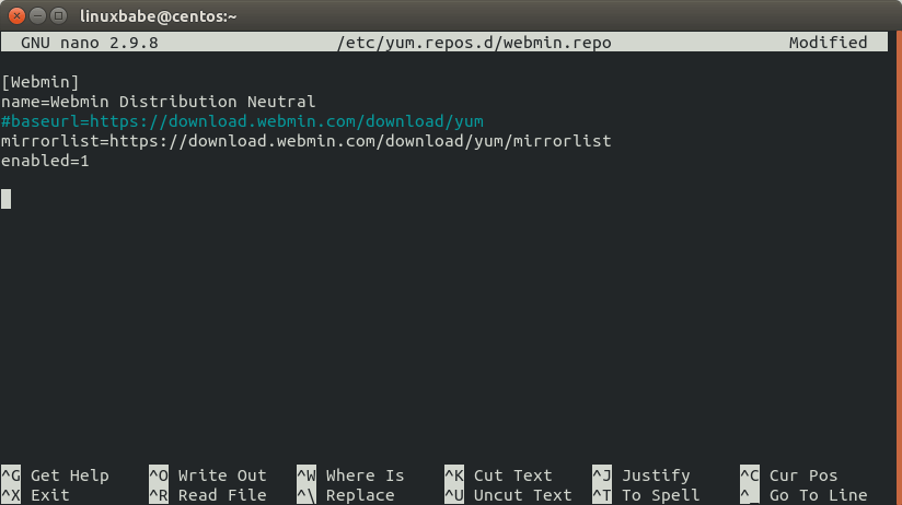 [Webmin] name=Webmin Distribution Neutral #baseurl=https://download.webmin.com/download/yum mirrorlist=https://download.webmin.com/download/yum/mirrorlist enabled=1