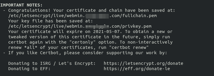 The certificate should now be obtained and automatically installed. And you will be able to access Webmin web interface over a secure HTTPS connection.