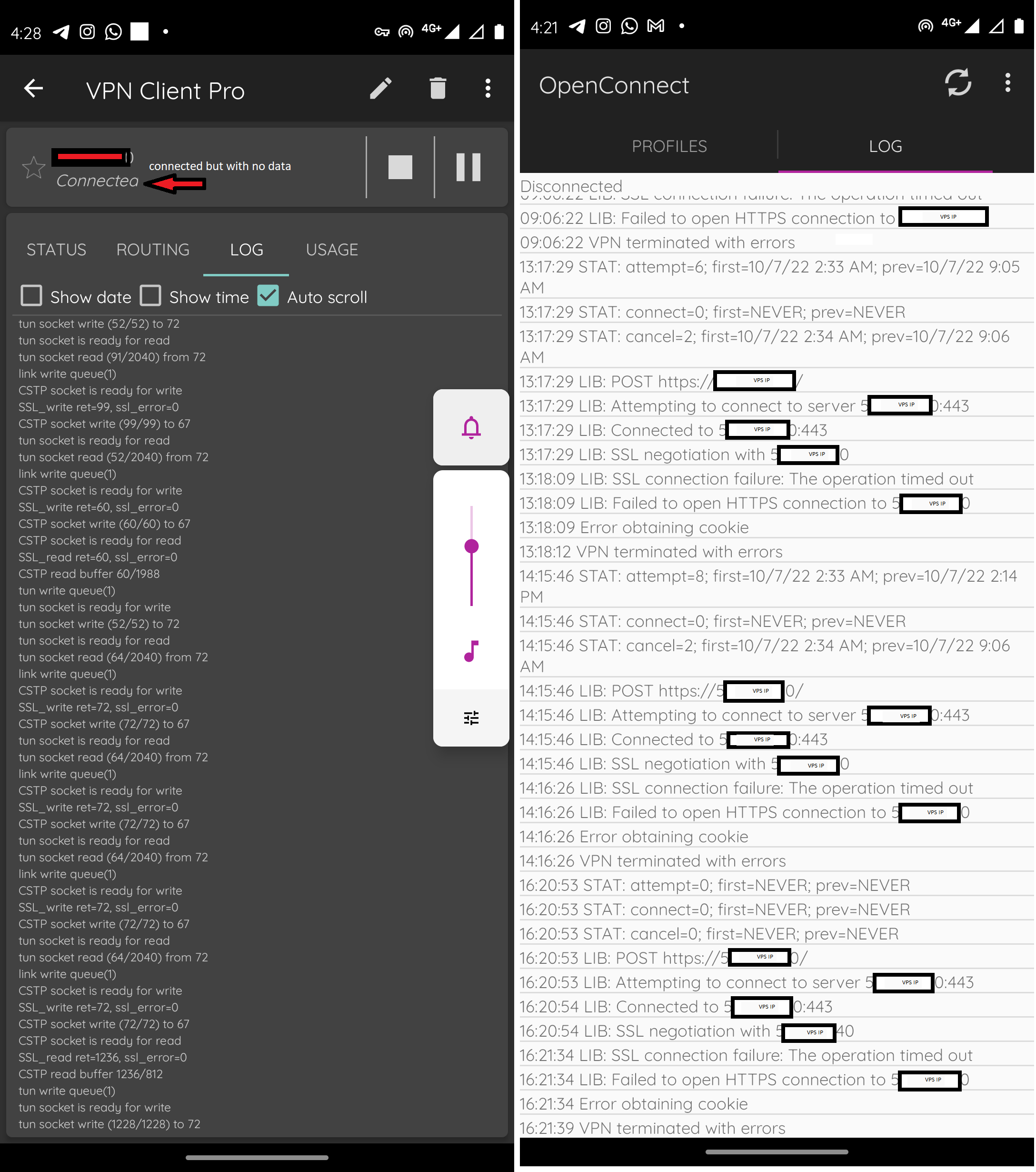 *** The other thing I experienced is if I use “VPN Client Pro” app which provides a built-in openconnect connection I can connect successfully for about 30 sec with data transferred amazingly good but after that the connection will terminated or remain connected but without any internet. I provided you a pic of its level 2 log file in attachments.