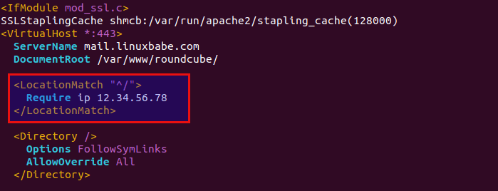 Add the following lines between the <VirtualHost>...</VirtualHost> tags. This will allow only the IP address 12.34.56.78 to access the webmail, and deny all other IP addresses.