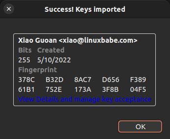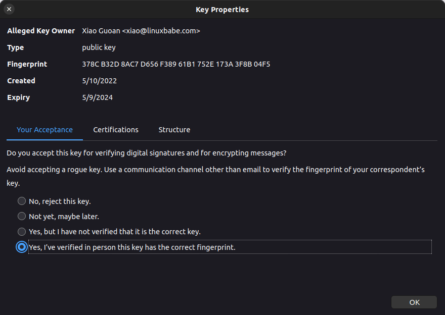 Compare the two fingerprints. If the two fingerprints match, then you can be sure it’s the correct public key, and you should select Yes, I’ve verified in person this key has the correct fingerprint and click the OK button.