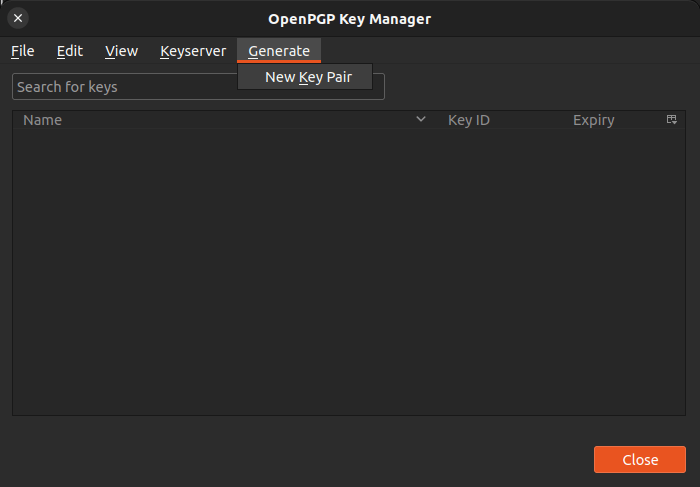 Then select Generate -> New Key Pair. (Note that if you didn’t add an email account in Thunderbird, then you won’t be able to generate a key pair in Thunderbird.)