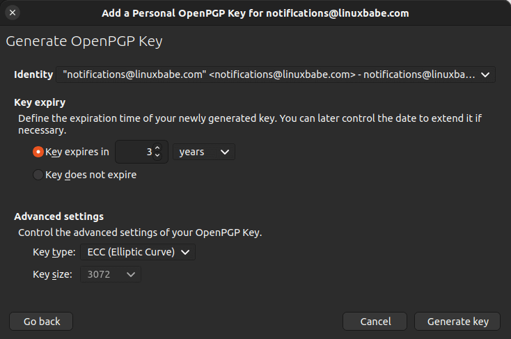 Identifydropdown menu. I have only one email account on this computer, so I use the default identity. - Your key will expire in 3 years, which is fine. You can always extend the time in Thunderbird when your key is about to expire.
