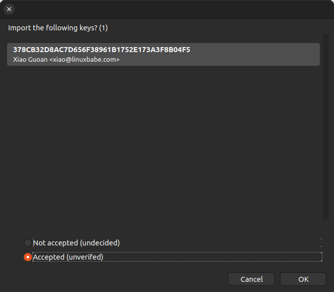 As you can see, it found my public key. Select Accepted (unverified) and click OK button.