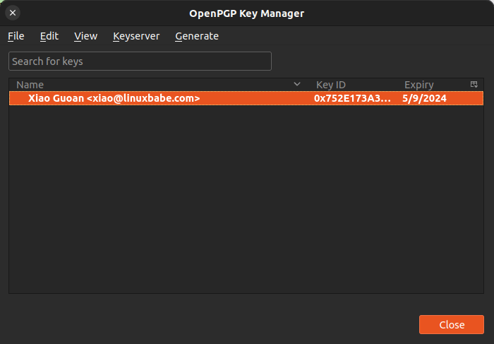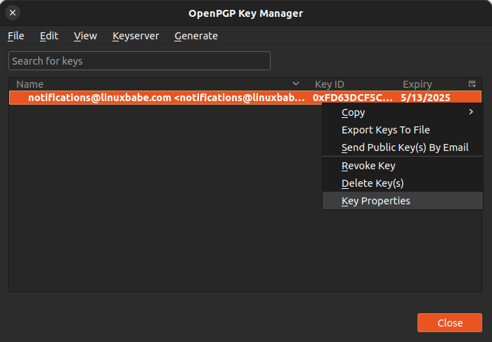 Your key pair will be generated in a jiffy. It will appear in the OpenPGP key manager window. You can right-click on it and select Key Properties to check detailed information about your key. You are able to extend the expiration time in the Key Properties window.
