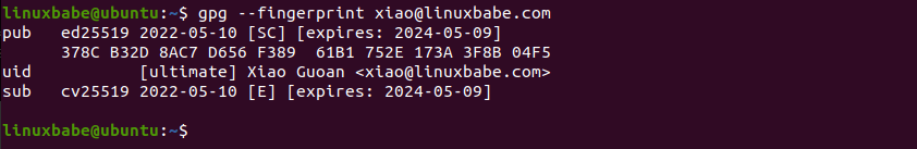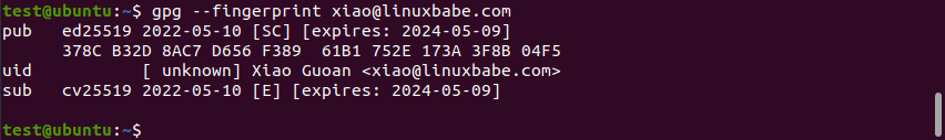 Now open another terminal window, so you will be using the original account, and check the fingerprint of the GPG key.
