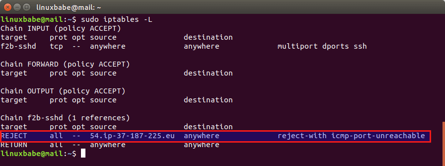 The fail2ban-server program included in fail2ban monitors log files and issues ban/unban command. By default, it would ban a client’s IP address for 10 minutes if the client failed password 5 times. The ban is done by adding iptables firewall rules. You can check iptables rules by running the following command.