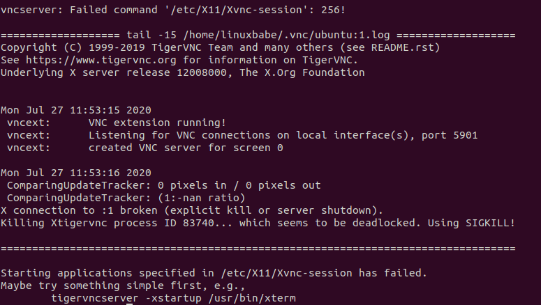 Process: 59630 ExecStartPre=/usr/bin/vncserver -kill :1 > /dev/null 2>&1 (code=exited, status=0/SUCCESS)