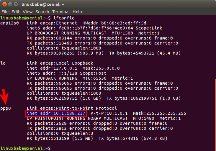 You will probably see a new interface called ppp0 and the IP address.