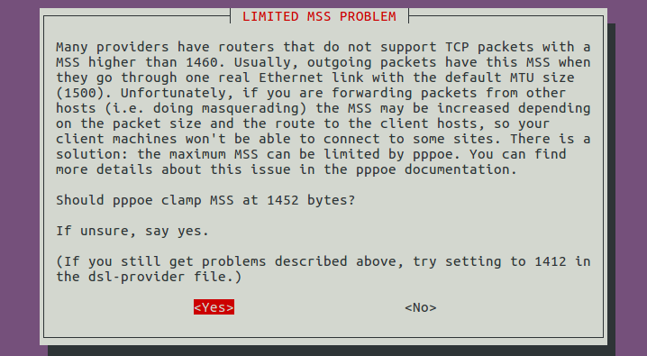 When asked if you want the noauth and defaultroute options and to remove nodetach – choose “Yes”.