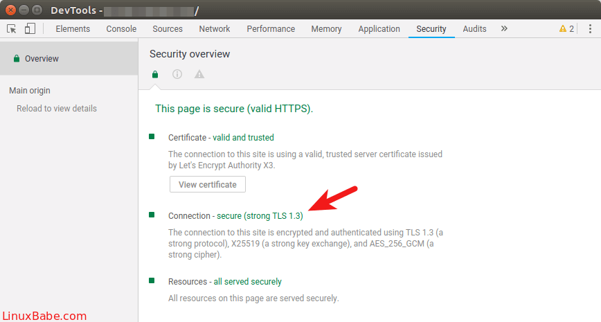 Now visit your TLS 1.3 enabled website in Google Chrome beta and press Ctrl+Shift+I to open the developer tools page. Go to Security tab. You can see the version of TLS in use.