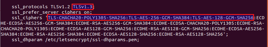 server { listen 443 ssl http2; server_name site.se; ssl_certificate /etc/letsencrypt/live/site.se/fullchain.pem; ssl_certificate_key /etc/letsencrypt/live/site.se/privkey.pem; ssl_session_timeout 180m; ssl_prefer_server_ciphers on; ssl_ecdh_curve secp384r1; ssl_protocols TLSv1.2 TLSv1.3; ssl_ciphers 'TLS-CHACHA20-POLY1305-SHA256:TLS-AES-256-GCM-SHA384:TLS-AES-128-GCM-SHA256:ECDH+AESGCM:ECDH+AES256:ECDH+AES128:!ADH:!AECDH:!MD5'; ssl_dhparam /etc/ssl/certs/dhparam.pem; location / { root /usr/share/nginx/tls13; } }Are you sure your ciphers are correct, shouldn’t they include 13: