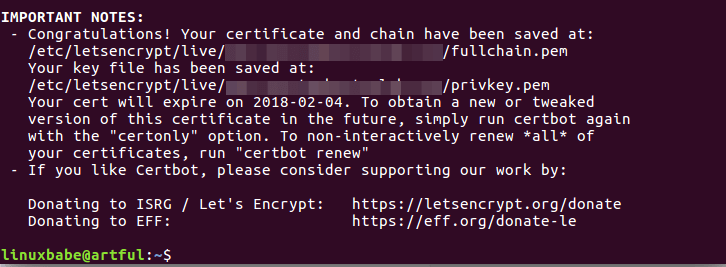 You will be asked if you want to receive emails from EFF(Electronic Frontier Foundation). After choosing Y or N, your SSL certificate will be automatically obtained and configured for you, which is indicated by the message below.