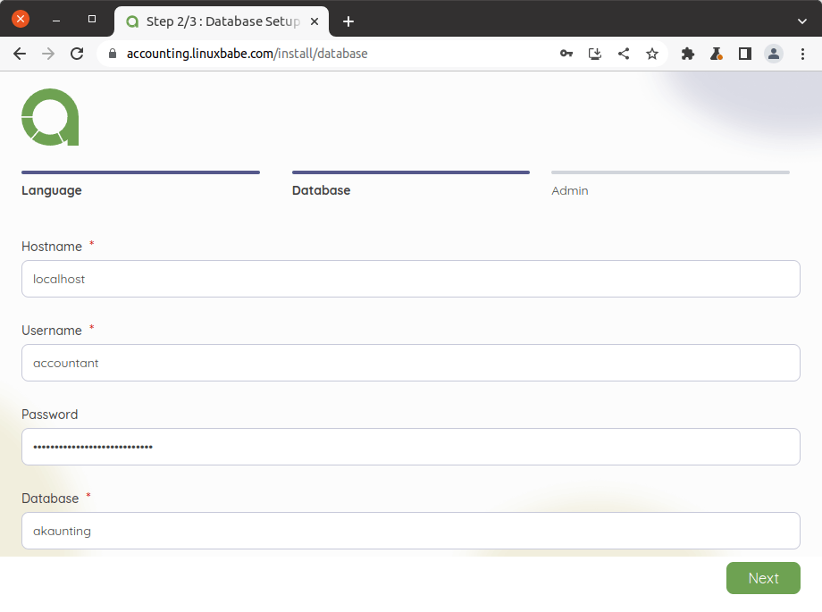 Now go to https://accounting.yourdomain.com/install and the setup wizard will appear. First, you need to choose your language.