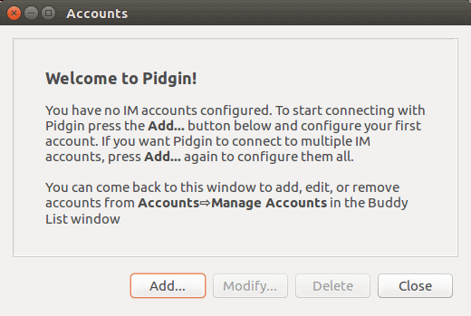 Upon the first launch, you will need to add an account in Pidgin. Click Add button.