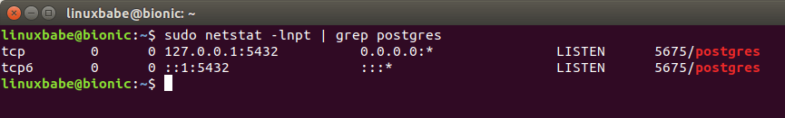 PostgreSQL database server will automatically start and listens on 127.0.0.1:5432, as can be seen with the following command. (If your Ubuntu server doesn’t have the netstat command, you can run sudo apt install net-tools command to install it.)