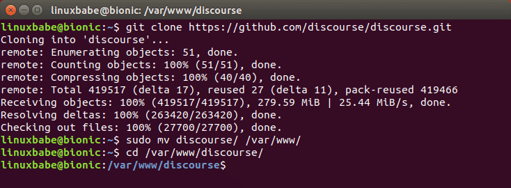 Assuming you are at your home directory, run the following command to clone the Discourse code repository from Github.