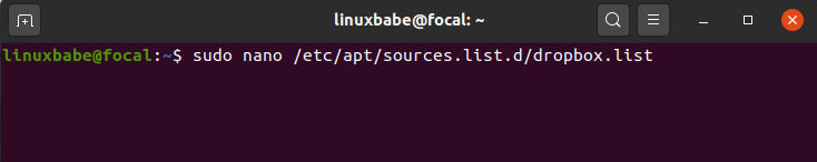 If you don’t have a Dropbox account yet, then click here to sign up. Next, open a terminal window, run the following command to create a source list file for Dropbox. Nano is a command line text editor, which allows you to edit text files in the terminal.
