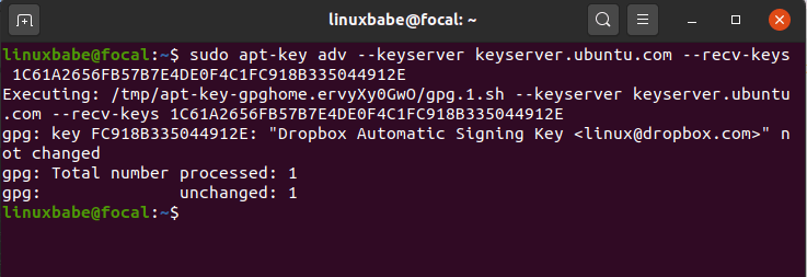 To save the file in Nano text editor, press Ctrl+O, then press Enter to confirm. To exit the file, press Ctrl+X. Next, we need to run the following command to import Dropbox GPG key to Ubuntu 20.04 system.