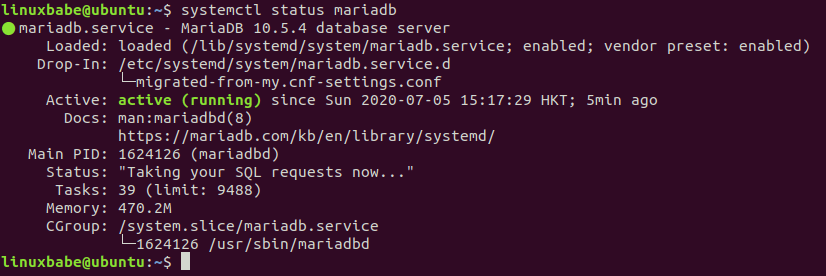Once the installation finishes, MariaDB server automatically starts. You can check its status with: