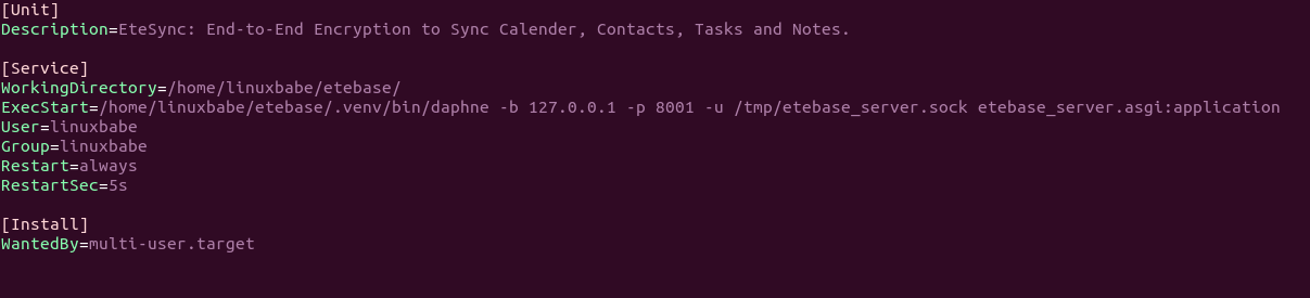 [Unit] Description=EteSync: End-to-End Encryption to Sync Calender, Contacts, Tasks and Notes. [Service] WorkingDirectory=/home/username/etebase/ ExecStart=/home/username/etebase/.venv/bin/daphne -b 127.0.0.1 -p 8001 -u /tmp/etebase_server.sock etebase_server.asgi:application User=username Group=username Restart=always RestartSec=5s [Install] WantedBy=multi-user.target