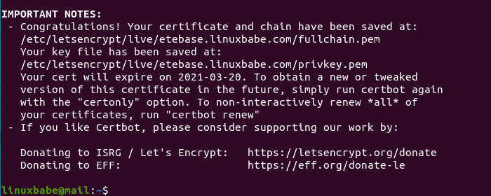 sudo certbot --apache --agree-tos --redirect --hsts --staple-ocsp --email [email protected] -d etebase.example.com