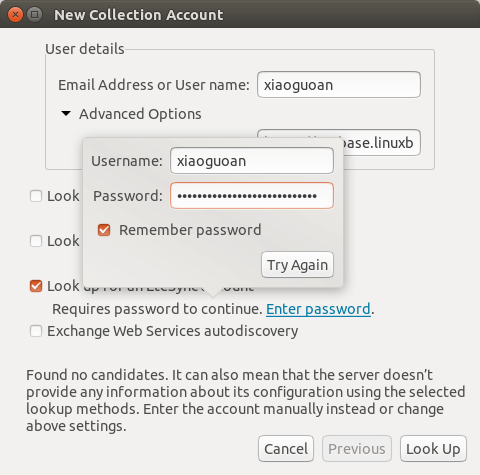 Then enter your EteSync usename and server address. Note that you need to add https:// as the prefix of the server address. Select Look up for an EteSync account and untick all other options. Then click the Look Up button.