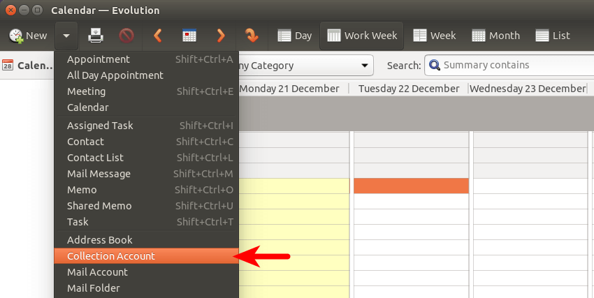Now launch the Evolution app on your Ubuntu desktop. Click the New button in the toolbar and add a new collection account.