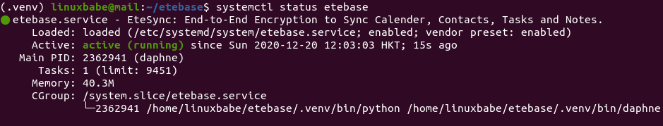 We can manually start EteSync with daphne -b 0.0.0.0 -p 8001 etebase_server.asgi:application, but it’s more convenient to run EteSync as a systemd service in the background. Press Ctrl+C to stop the current EteSync instance.