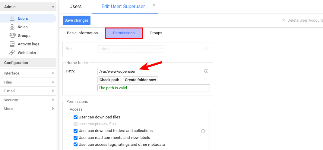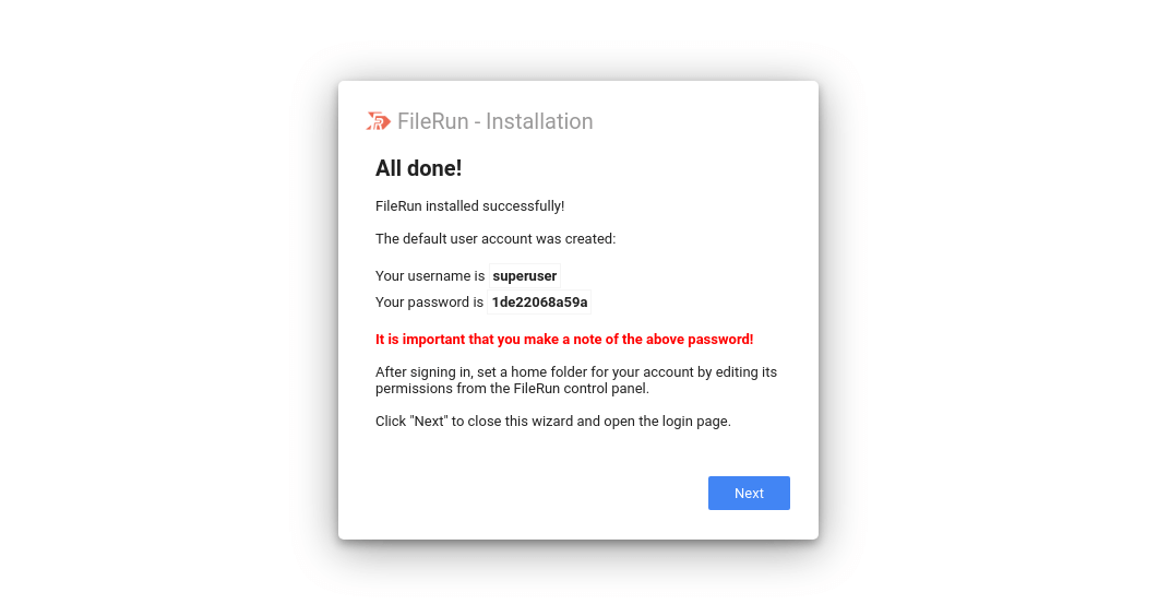 On the next screen, you can log in with the superuser account. Upon first login, you need to create a home folder for the superuser account.