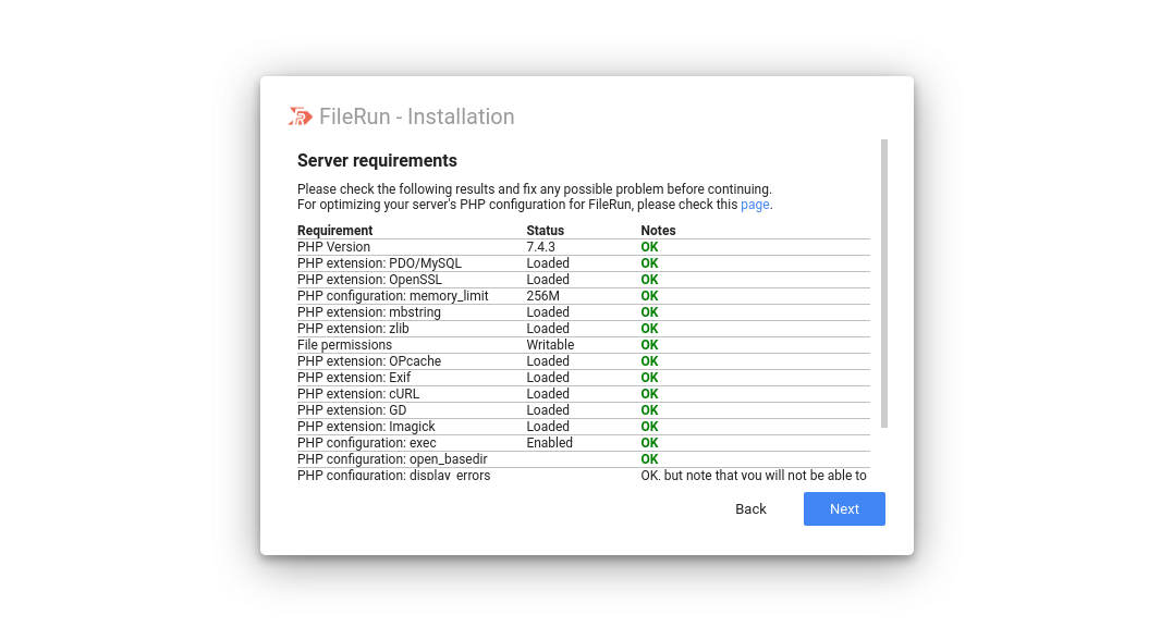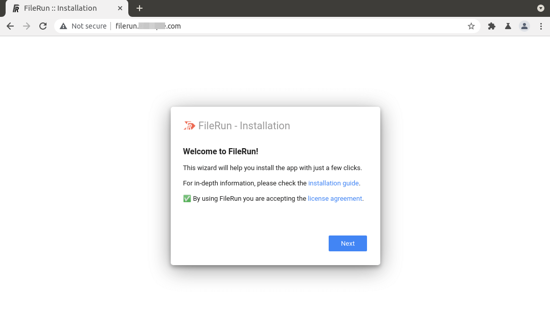 Go to https://filerun.example.com to launch the web-based install wizard. Then click Next button.