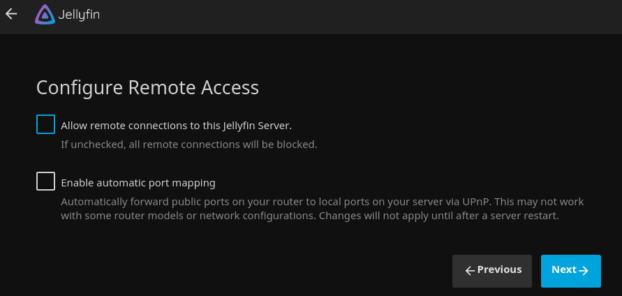 Click Ok and Next button. You can always add more libraries later. The next step allows you to choose if remote access will be enabled. I don’t recommend enabling the native remote access method, because it doesn’t provide HTTPS encryption, so untick both checkboxes. If you need remote access, please read how to set up reverse proxy later in this article.